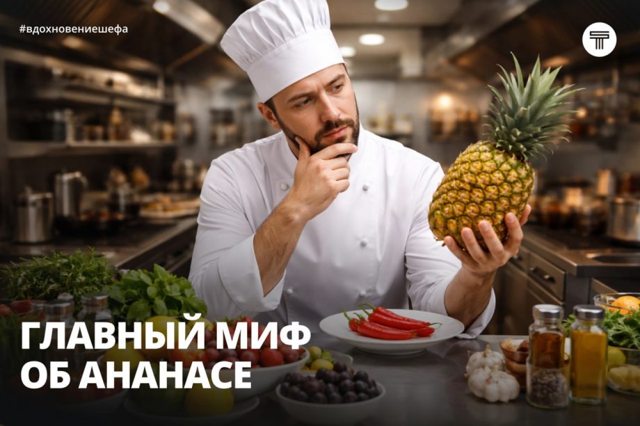 Шефы, знаете ли вы, что ананас — на самом деле не один большой плод? Это множество маленьких ягод, которые срослись вместе вокруг сердцевины. Каждая «чешуйка» на кожуре когда-то была отдельным цветком.