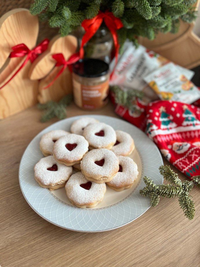 6. Посыпьте верхнюю часть печенья сахарной пудрой и скрепите половинки джемом.