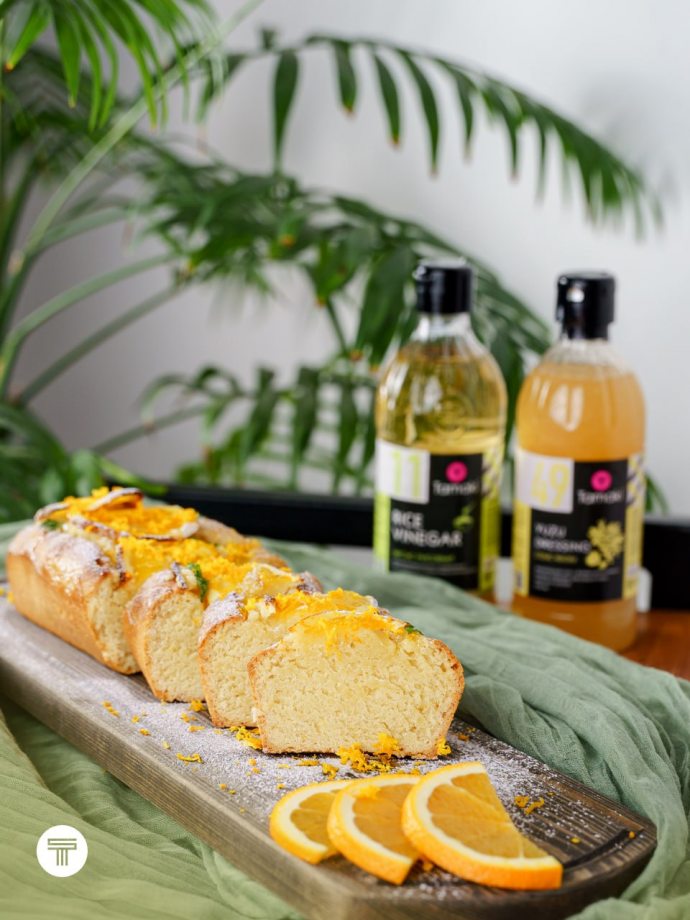 Готовый кекс смажьте соусом Юдзу, посыпьте сахарной пудрой и украсьте цедрой апельсина.