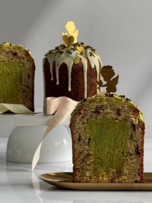 5. Сборка кулича: в центре подготовленного кулича вырежьте «крышечку», удалите аккуратно ложкой часть мякоти, заполните получившуюся полость начинкой, закройте «крышечкой». Обмажьте теплой глазурью и украсьте фисташками.