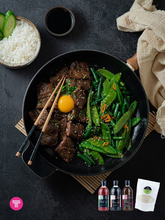 1. Мясо говядины нарежьте тонкими слайсами, залейте смесью соусов вок и кимчи, оставьте мариноваться 1-2 часа (можно оставить на ночь).