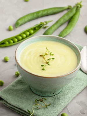 на среднем огне. Влейте кокосовое молоко, размороженный горошек, доведите до кипения. В конце добавьте мяту, прогрейте 1-2 минуты. Пробейте блендером до однородной кремовой консистенции. Доведите до вкуса солью и молотым перцем. При подаче украсьте веточками тимьяна.