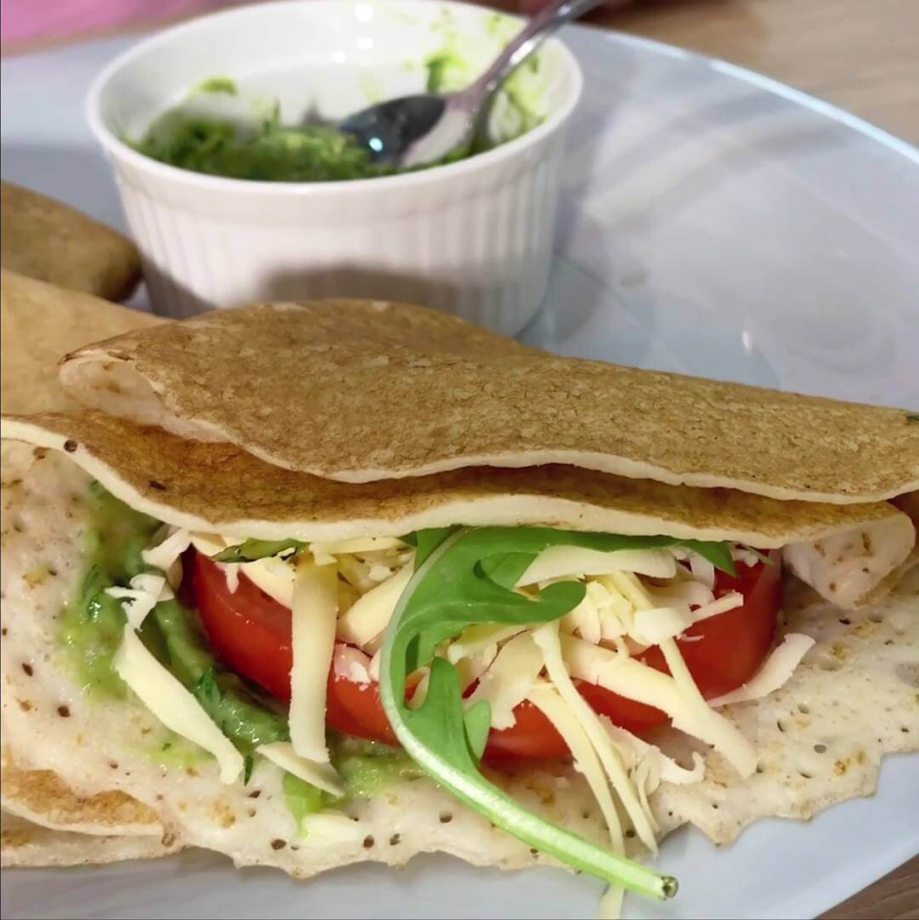 Шаг 3. На середину разогретого блинчика выложите чайную ложку соуса из авокадо.