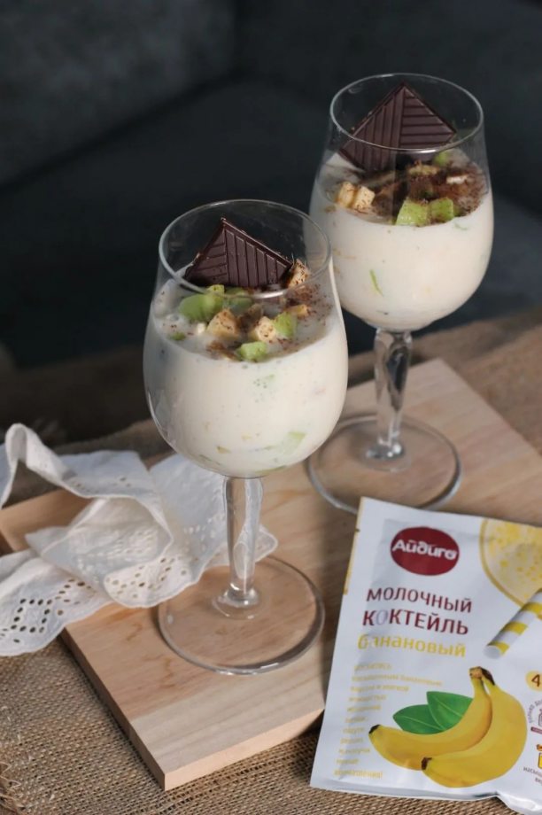 Этот десерт больше похож на изысканное пирожное в стакане. Нежная сливочно-зефирная шапка, сочные кусочки банана и киви и лёгкий шоколадный акцент создают удивительно гармоничный и освежающий десерт. Он идеально подойдёт для романтического ужина или просто чтобы побаловать себя в выходной день.