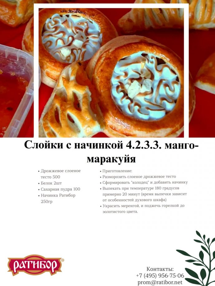 Здравствуйте, дорогие ценители выпечки! Сегодня мы хотим поделиться с вами рецептом, который пробудит ваши вкусовые рецепторы и перенесет в жаркие тропики. В основе нашего летнего десерта – изысканная начинка 4.2.3.3. Манго-Маракуйя от компании "Ратибор"! Её яркий, кисло-сладкий вкус идеально сочетается с нежностью слоёного теста.