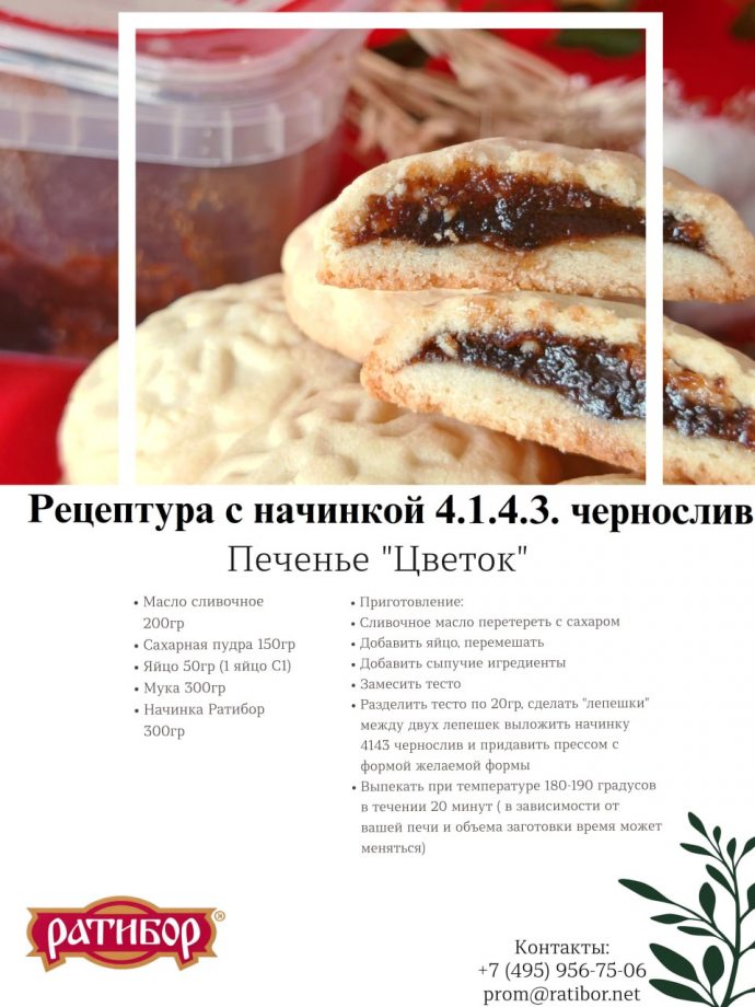 Сегодня делимся с вами рецептом невероятно нежного и ароматного печенья "Цветок", которое станет настоящим украшением вашего ассортимента. А секретный ингредиент – сочная и термостабильная начинка чернослив "Ратибор" – придаст ему особую пикантность!
