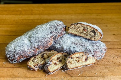 Отделка:верхнюю поверхность горячего штоллена смазать растопленным сливочным маслом и обильно посыпать пудрой