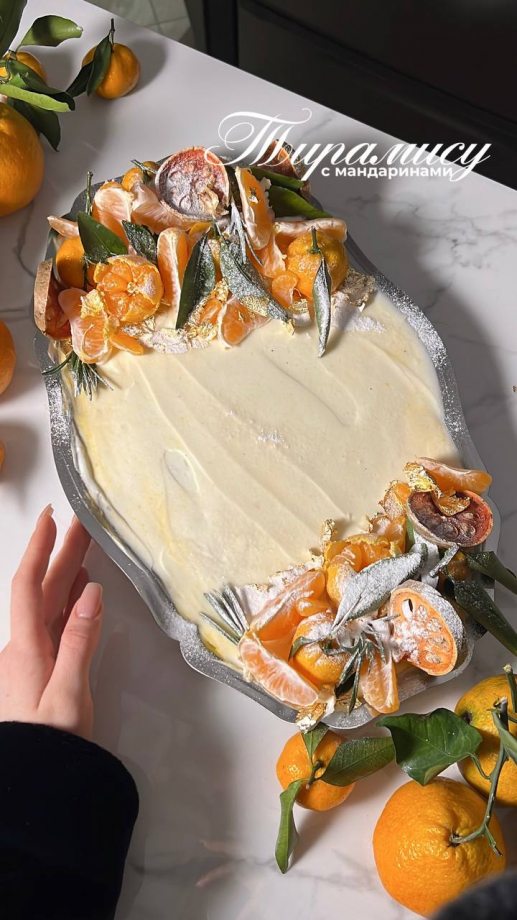 Отправляем в холодильник на 3-4 часа отдохнуть и украшаем мини-мандаринками и сахарной пудрой!)