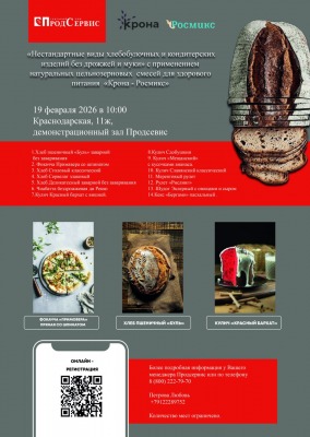 Приглашаем Вас на семинар от нашего партнера компании Крона - Росмикс. 📅 19 февраля 2026 г в 10.00 📍Краснодарская, 11 ж, демонстрационный зал Продсервис 🎯 В программе семинара: 1.Хлеб пшеничный «Буль» заварной без заваривания 2. Фокачча Примавера со шпинатом 3. Хлеб Столовый классический 4. Хлеб Сервелат злаковый 5. Хлеб Деликатесный заварной без заваривания 6. Чиабатта бездрожжевая ди Рекко 7.Кулич Красный бархат с вишней. 8.Кулич Сдобушкин. 9. Кулич «Мещанский» с кусочками ананаса. 10. Кулич Славянский классический 11. Меренговый рулет 12. Рулет «Рислинг» 13. Шудог Эклерный с овощами и сыром 14.Кекс «Бергамо» пасхальный . 👉 Участие бесплатно, обязательна предварительная регистрация: ⭐️ Регистрация доступна по ссылке 💬 Ждем вас на увлекательное мероприятие, будем рады видеть вас! 💝