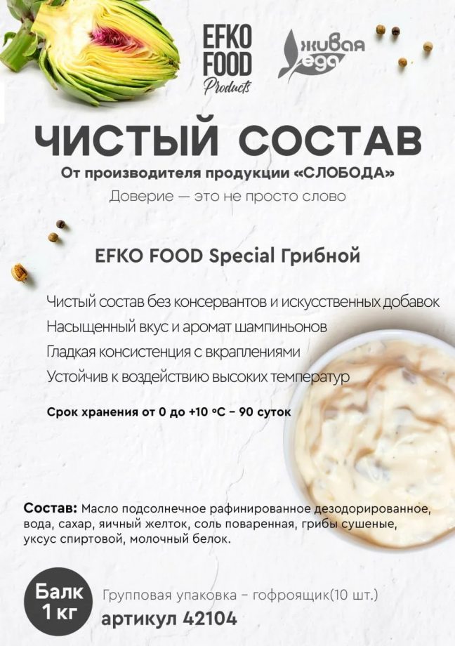 Доверие — это не просто слово. Это выбор в пользу натурального, понятного и надёжного. Почему это спецпредложение? Мы объединили профессионализм бренда «СЛОБОДА» и любовь к чистой кулинарии. В этом продукте нет ничего лишнего — только то, что работает на вкус, текстуру и стабильность. Что внутри: · Никаких консервантов и искусственных добавок · Благородный вкус шампиньонов, раскрывающийся в готовом блюде · Идеальная гладкость с аппетитными вкраплениями · Высокая термостойкость — не теряет свойств при нагреве Для кого: Для шеф-поваров, технологов и всех, кто хочет получать безупречный результат без компромиссов. Условия хранения: от 0 до +10 °C — 90 суток Фасовка: 1 кг Упаковка: гофроящик по 10 шт. Для заявки Вы всегда можете обратиться к нашим менеджерам: 8-800-222-79-70 А так же сделать заявку самостоятельно в нашем интернет-магазине